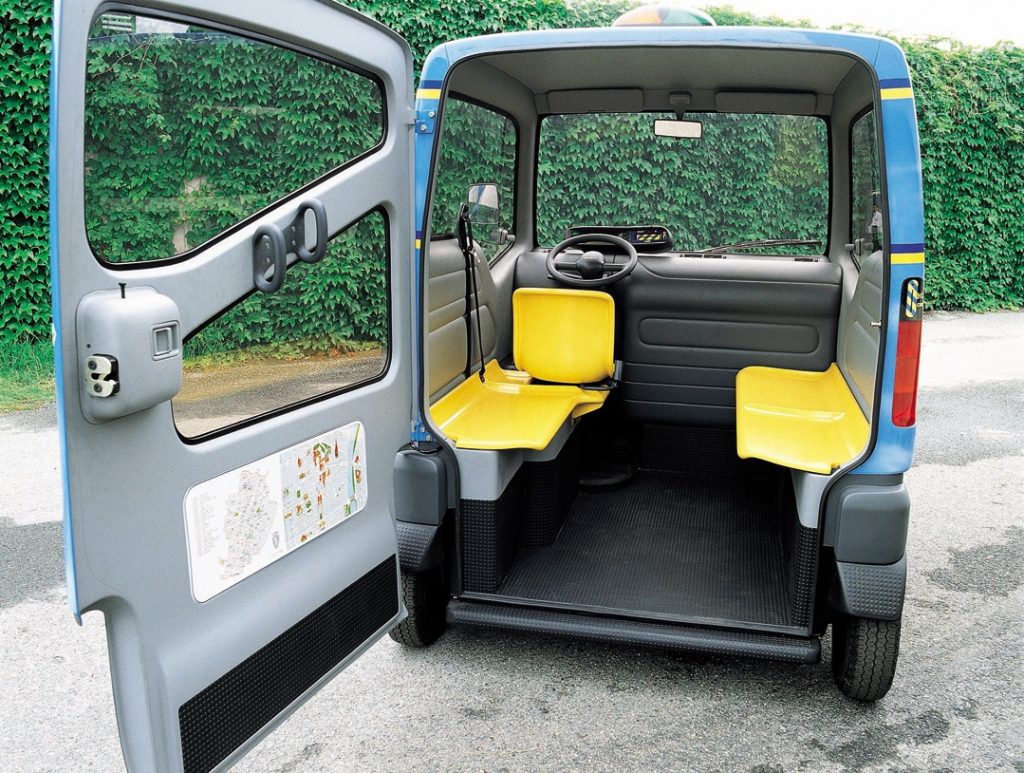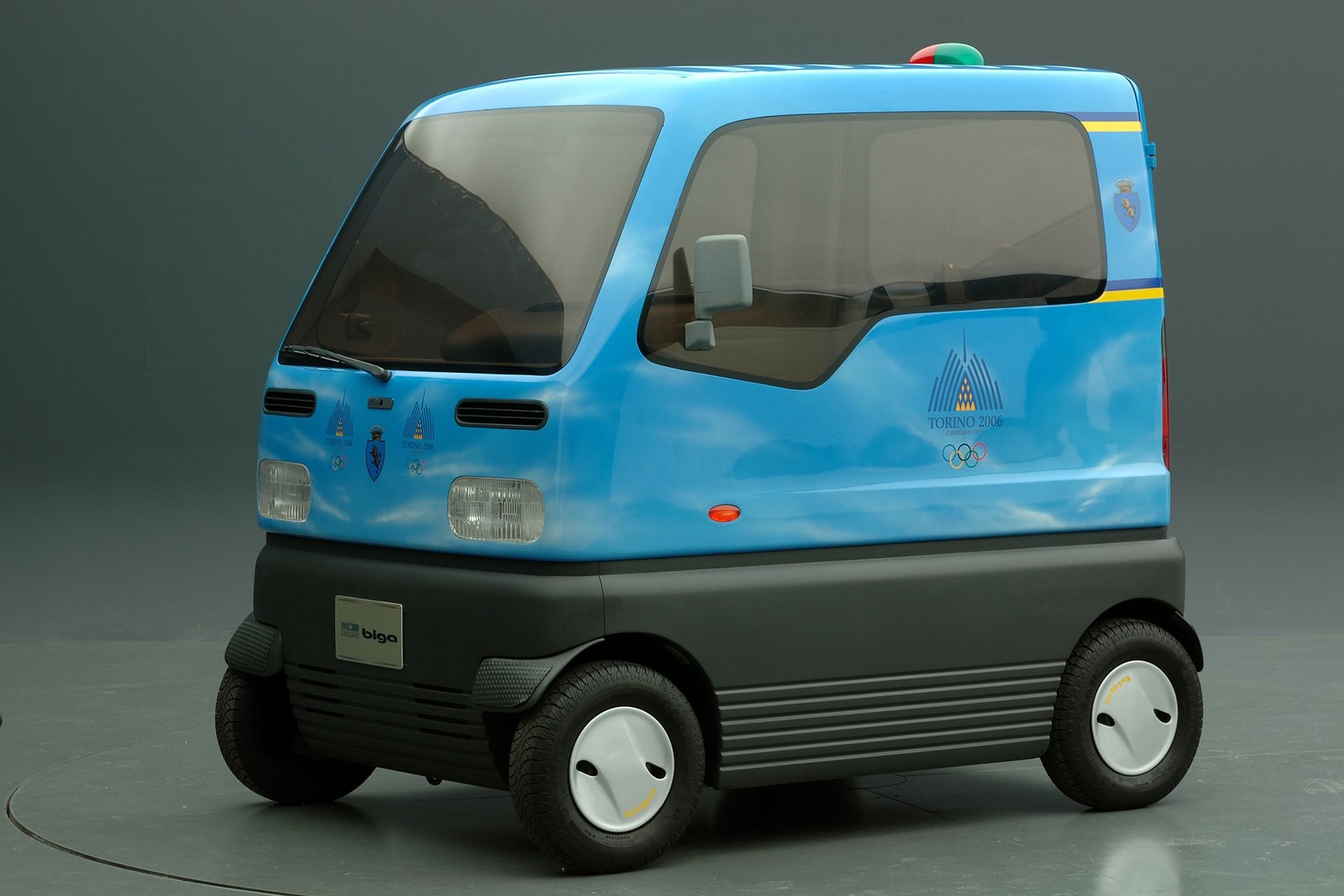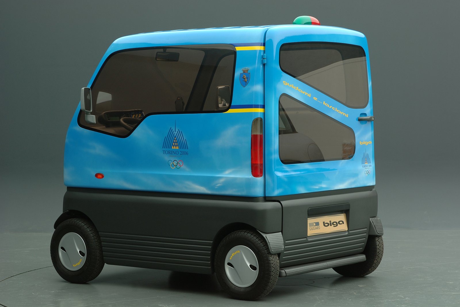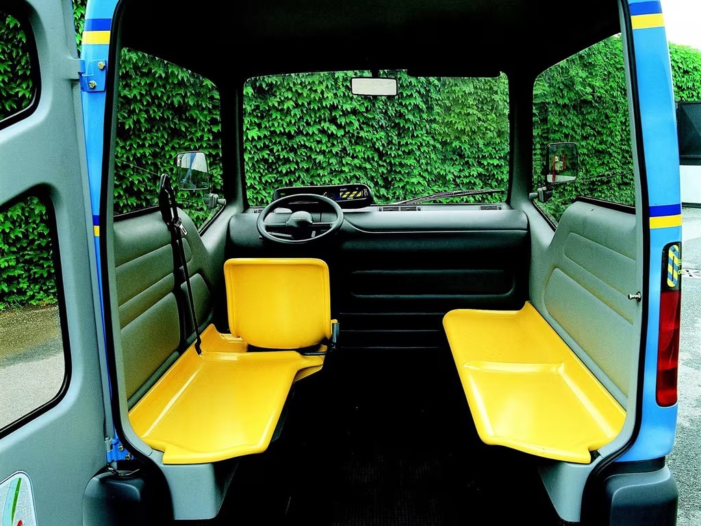 Entry was through a single rear tailgate, echoing the layout of a Roman chariot. This unusual solution optimized urban space: parking was designed perpendicular to the sidewalk, allowing occupants to step directly onto the pavement. The vehicle’s height further eased wheelchair access, and the absence of side doors meant multiple Bigas could be parked tightly together without wasting space.
