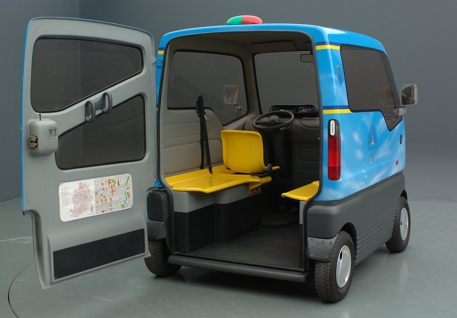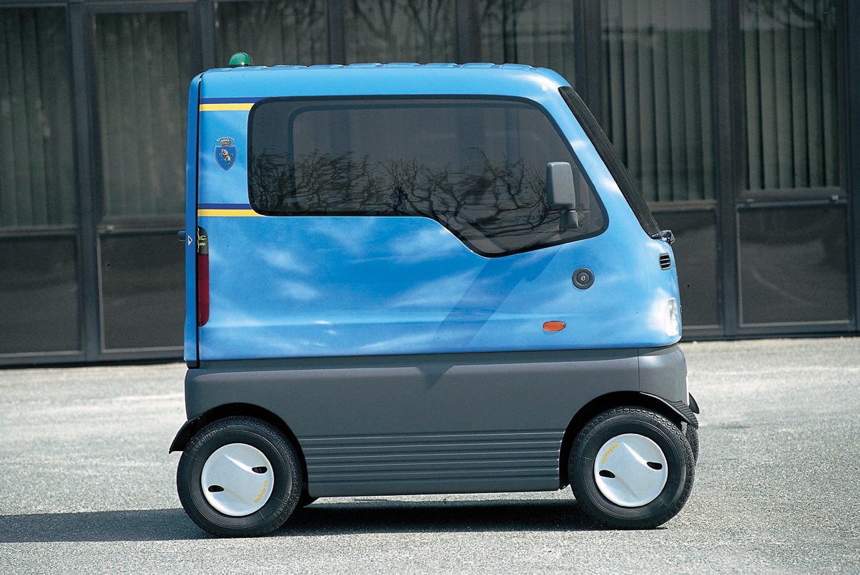 Access would be controlled via a personal card linked to a central database, allowing users to pick up a Biga from designated parking points, drive it, and leave it at another approved location—an early vision of shared urban mobility.