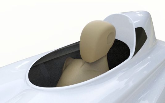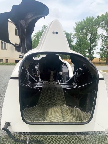 The lightweight body is made of a composite material consisting of aramid and carbon fibers in an epoxy matrix. A lockable hatch from the top provides access to the cockpit, while a smaller hatch at the rear provides access to the 350-liter cargo area.