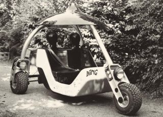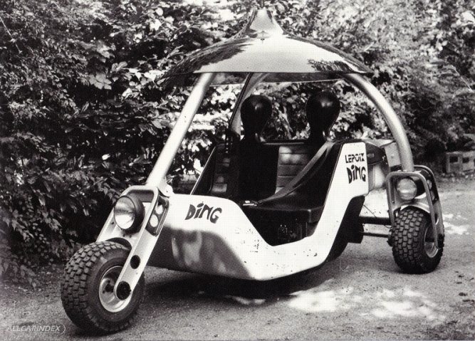 However, while the Shopi was meant for mundane errands, the Lepoix Ding was outrageous and slightly baffling. Its molded plastic body and side-by-side seating were identical to the Shopi’s but, instead of riding on a steel underframe, it was suspended from a stout, arched external chassis/rollcage, on the end of whose three “legs” was a bubbleformed wheel/tire.