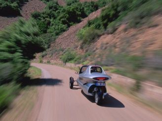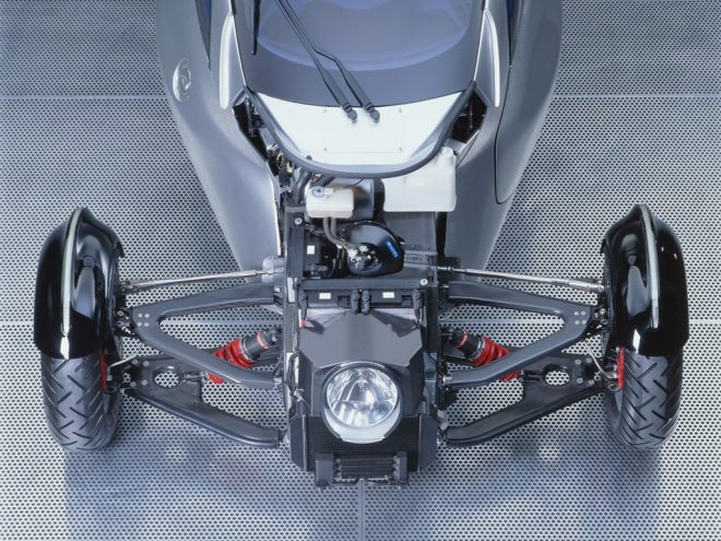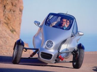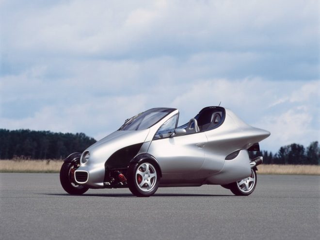 ATC would permit a g-force of 0.9, pretty exhilarating for a typical car driver—no helmet or leathers were required, the seats had belts, and air-conditioning was included. The aluminum chassis weighed just 196lb (89kg) while the bodyshell and vertically opening front-hinged doors were aircraftinspired. In good weather, the two roof sections could be removed and stowed in the boot. The Mercedes A-Class engine behind the passengers drove the single rear wheel through a five-speed manual gearbox. A sensor was added to automatically turn on the headlights in ambient light conditions.