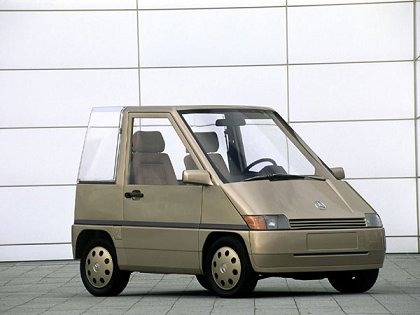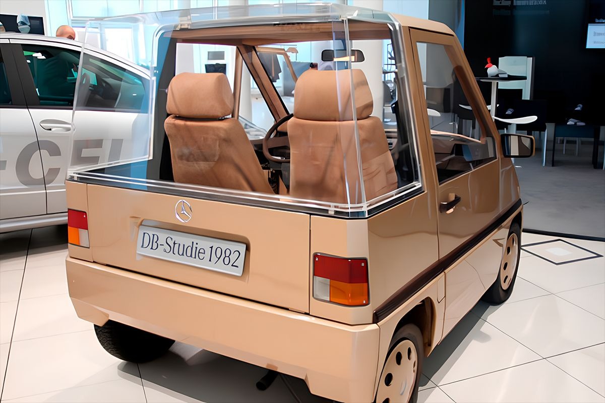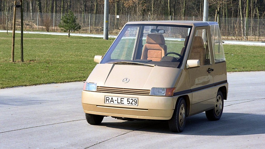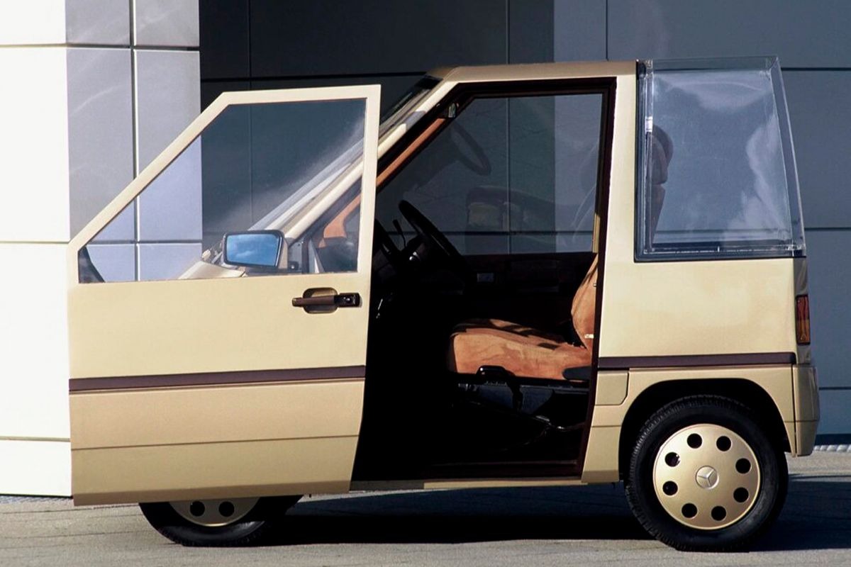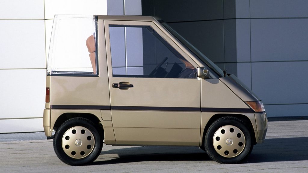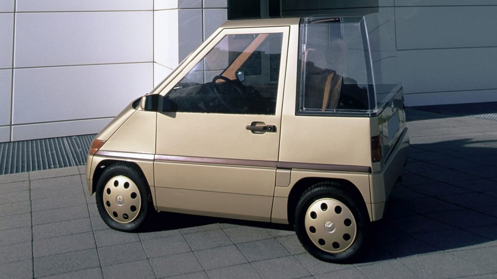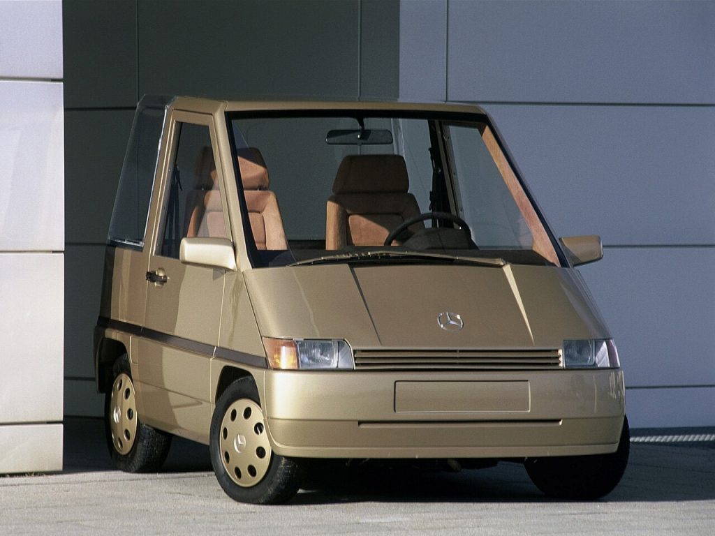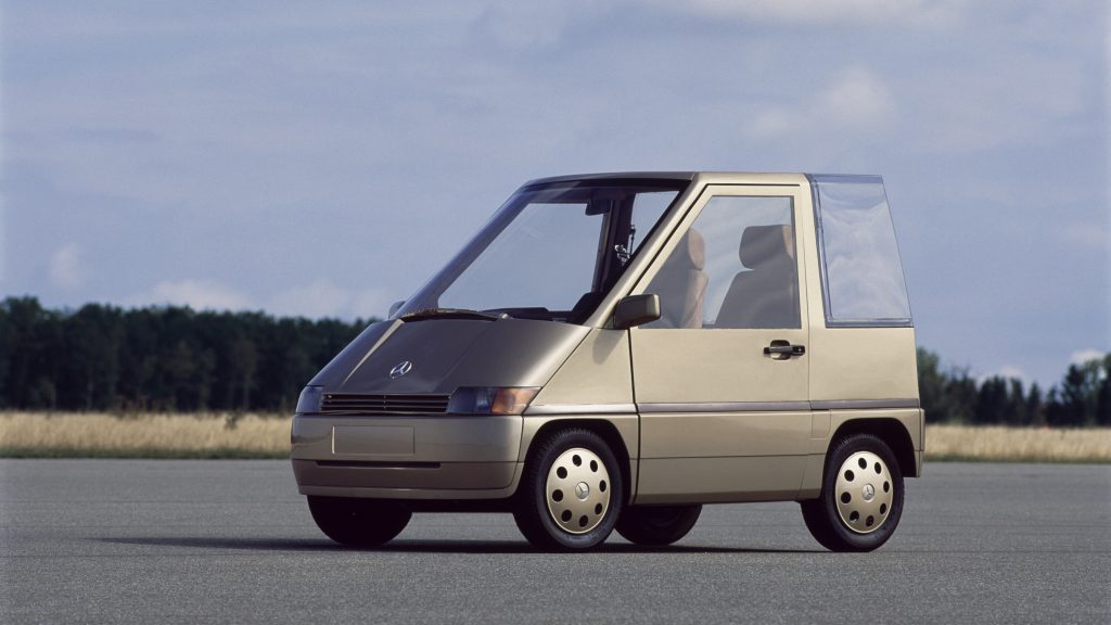 It featured four-wheel steering, automatic transmission, air conditioning, and front-wheel drive, packaged into a tiny two-seater format that Mercedes also envisioned in three- and four-seat variants.