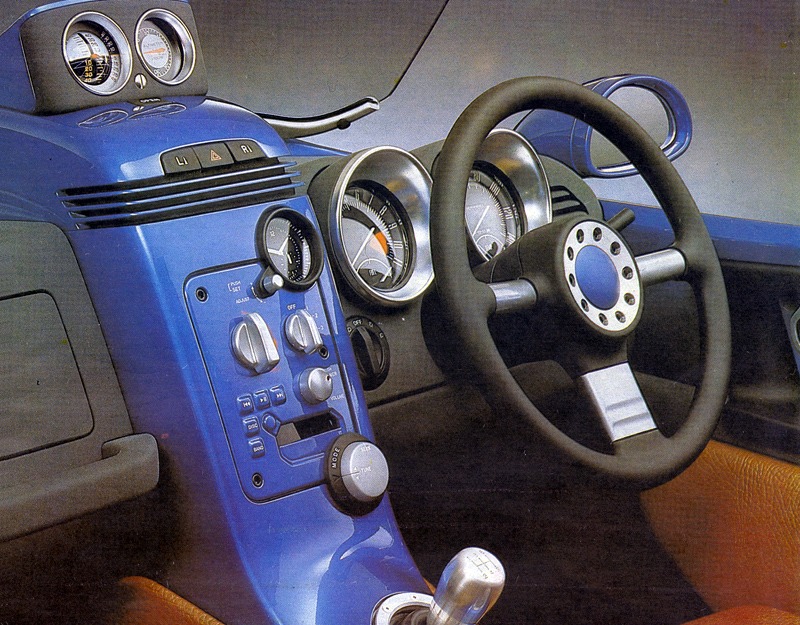The cockpit was designed in an unusual style reminiscent of a light aircraft. At the push of a button, an inclinometer paired with an altimeter rose from the dashboard between the wind deflectors — a device intended to help monitor steep climbs, as the designers jokingly suggested, when “scaling Mount Fuji.”