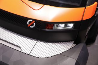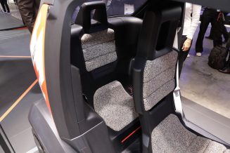 Simple square dashboard with big buttons and audio system’s loudspeaker in the right bottom corner is deliberately made in the spirit of portable cassette recorders of the late 80’s – early 90’s. There is no own multimedia system and navigation, their role will be performed by the driver’s smartphone.
