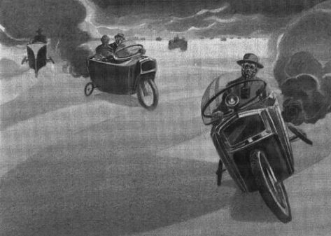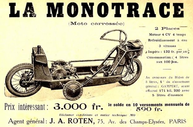 There were also Morgan-Monotrace monocars which were assembled by Monotrace at its factory in Courbevoie near Paris and sold by its trading company from the Champs Elysees. Their only feature was a special spring control system for the side support wheels, patented in 1922 by the German designer Alfred Morgan. Approximately 150 of these machines were built between 1923 and 1926.