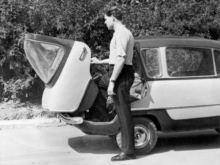 The designers wanted to provide maximum space inside the car with saving its compact dimensions. There were two seats for the driver and passenger in the front, and a full-fledged three-seater sofa in the back. Due to the high ceiling, the interior was quite spacious, but the convenience of getting in and out of the car let us down. Only one hinged door for the rear passengers was provided on the right. To get to the front seats you might fold the front end of the body, like on the Isetta. It was folded back together with part of the roof, which clearly did not add comfort in inclement weather. In addition, the tests revealed insufficient tightness of the joint of the hinged part (door) with the body.