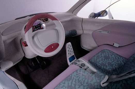 The chassis, suspension components and door structure were made from recyclable materials, 95% of the components in total. The luggage compartment under the hinged rear wall was just enough for larger purchases. The communications center, located between the two seats, included a cordless phone and Carminat navigation system, hidden from view, the top section flipped up. A safety air bag was located in the head of the adjustable steering wheel, the braking system was equipped with ABS. An interesting feature was the turn signals in the exterior rear view mirrors.