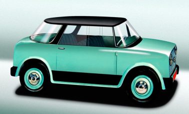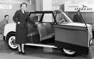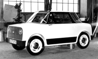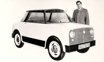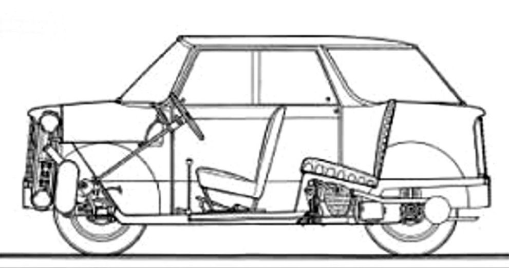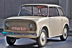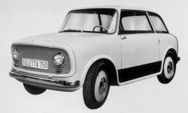 Two-door four-seater concept Soletta 750 was developed by Swiss designer Salzmann. The rear wheels were driven by a four-stroke twin-cylinder engine, mounted in front of the patented rear axle.