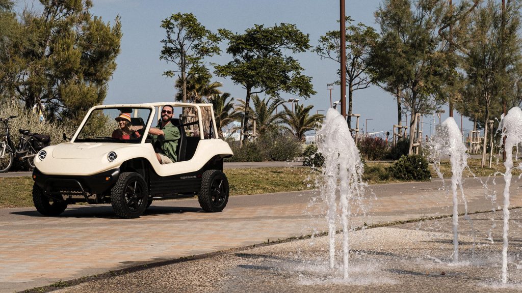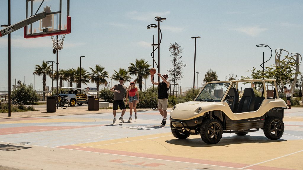 This 4-seater buggy features a raised driving position for better visibility and draws inspiration from classic off-road vehicles. Its lightweight structure uses aluminum castings bonded with aerospace-grade glue, paired with a rigid roll bar and load-bearing steel passenger cell for safety.