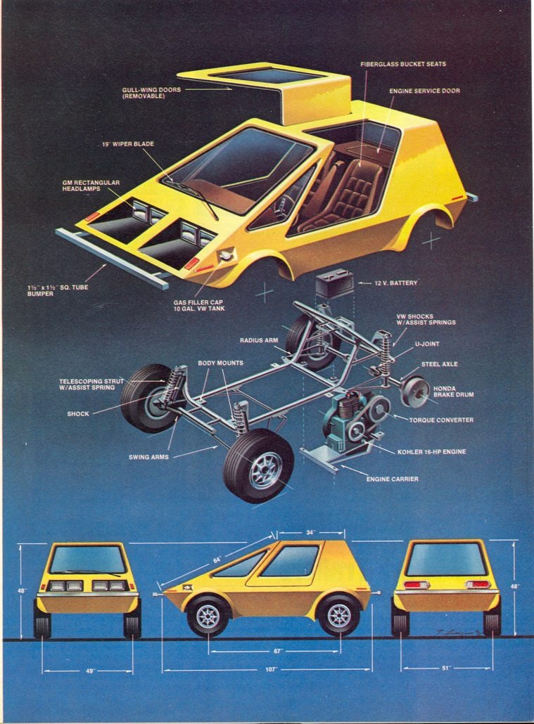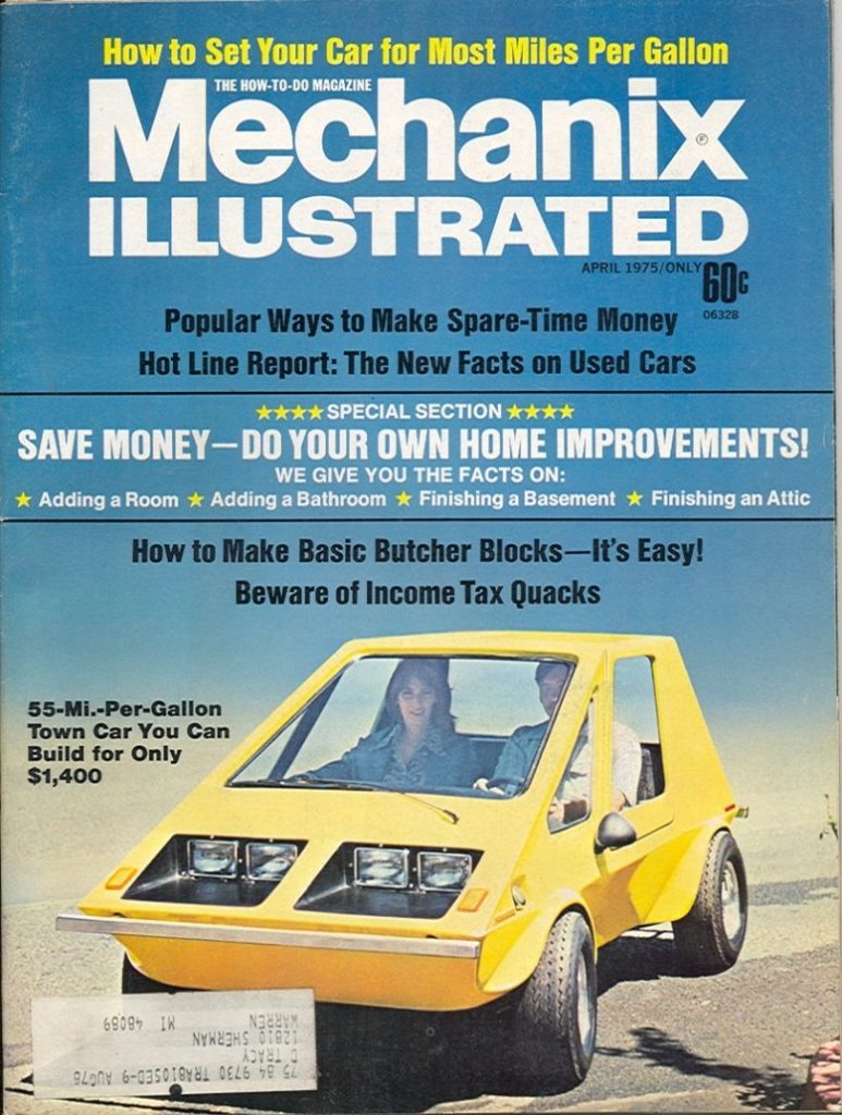 Besides knowing the cost of driving back and forth a penny a mile for fuel, this 35-mpg build-it-yourself two-seat errand-runner can cost as little as $1,400. Buying the parts as you go, you’ll never have to come up with that much scratch all at one time — Mechanix Illustrated 1970.