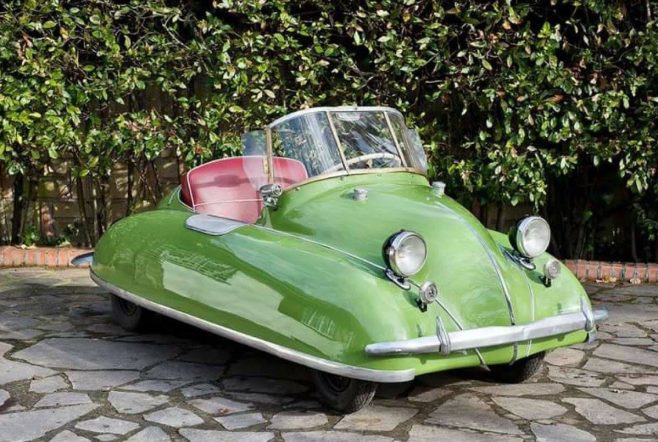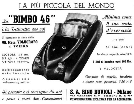 After the ending of the Second World War Italy was in terrible economic situation. But the Italians need cars, and at least with minimal comfort. And as part of meeting the demand the Bimbo microcar mady by Officine meccaniche Volugrafo was presented in 1946. It was designed by the engineer Claudio Belmondo.
