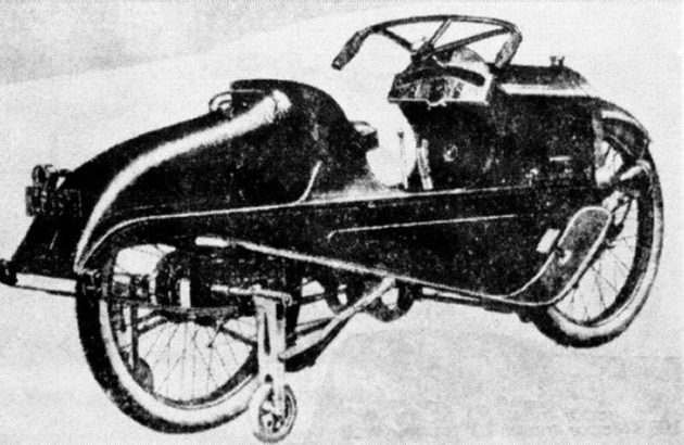 It pioneered the classic layout and appearance of future two-wheeled vehicles. The car used a water-cooled engine with an automobile radiator, a three-speed transmission, a tubular frame, and rear-wheel drive on a leaf-spring suspension. Its features were a peculiar half-rudder, two track rollers on longitudinal levers with a push-button locking device, a rear “shaped” gas tank and wide side steps.